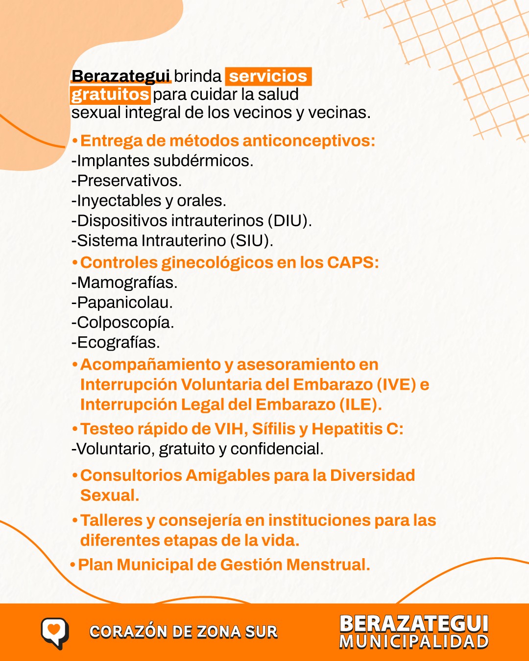 La Municipalidad de Berazategui garantiza el acompañamiento diario a las personas en su derecho a expresar y ejercer su sexualidad desde un marco de cuidados, autonomía, respeto y libertad. Por esta razón, se recuerda a los vecinos y vecinas que tienen a su disposición distintos servicios de salud gratuitos.